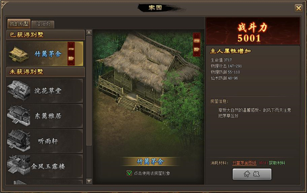 所有玩家初始默认激活“竹篱茅舍”,可通过击败首领掉落家园图纸来激活或升级更多的别墅。