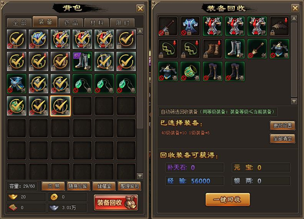 将不需要的装备道具进行回收,可获得元宝、银两、经验、补天石等道具。 装备回收是玩家获得元宝、银两、经验、补天石的主要途径之一。