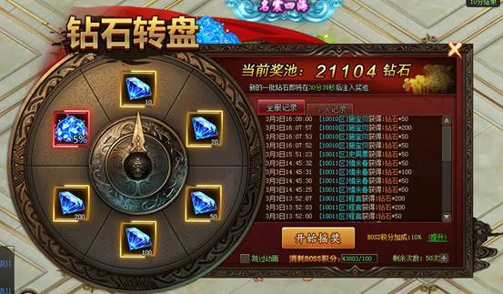 玩家击杀不同的BOSS,获得BOSS积分,消耗BOSS积分转动钻石转盘。
